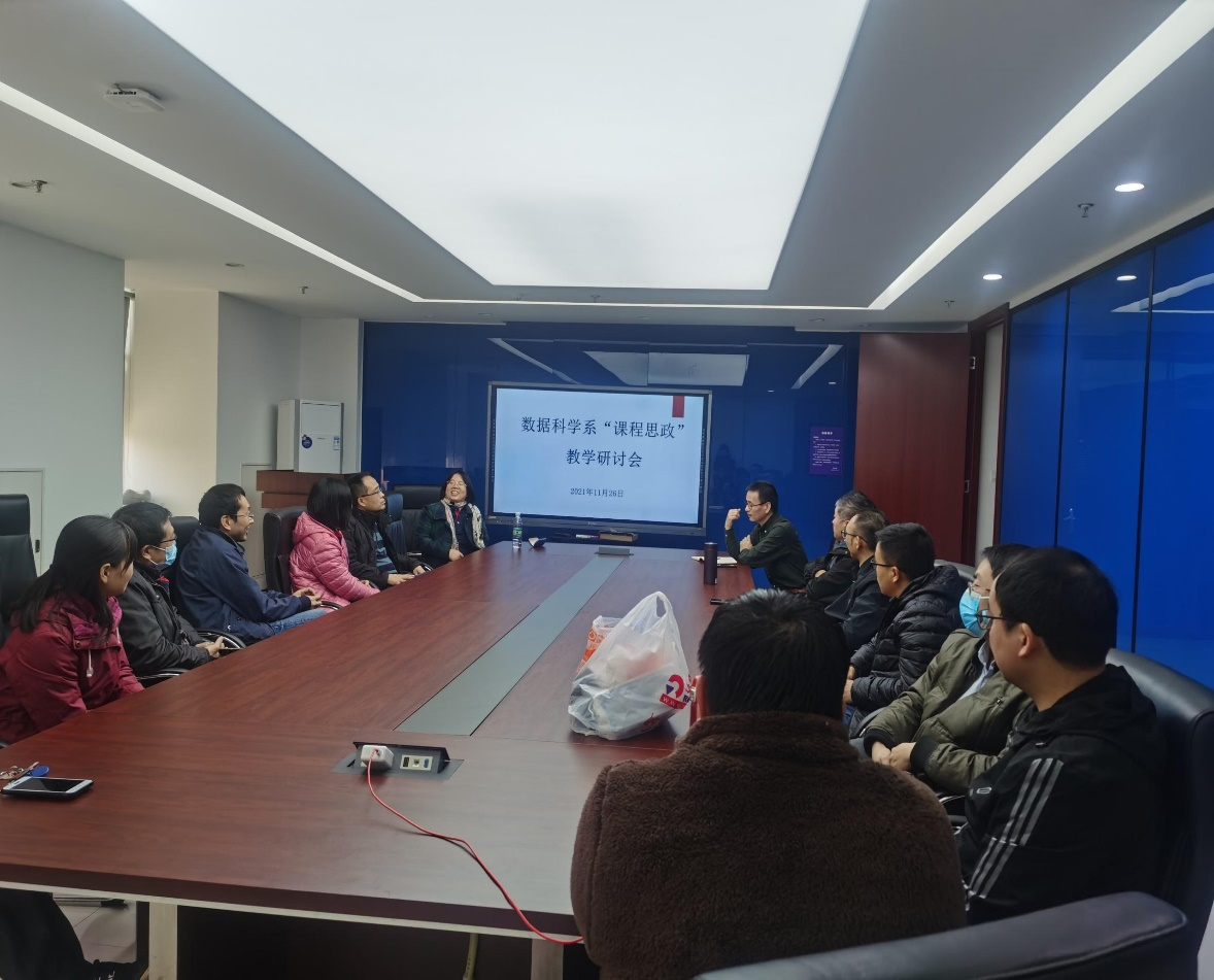2021年11月26日(周五)下午4点开始,数据科学系全体老师在实践大楼(学豪酒店)7楼会议室开展了“如何建设好统计学省级一流专业建设点” 教研活动和“课程思政”教学研讨会。会议分成三个部分:一是数据科学系系主任汇报了学院统计学省级一流专业建设情况;二是针对统计学国家一流专业申报面临的困难做了简要总结,发动系部老师群策群力、建言献策;三是数据科学系副系主任对“课程思政”建设做了详细解读,希望系部老师严格遵守教育部要求,将课程思政深度融入课堂教学中,立德树人。教研活动期间,系部老师踊跃发言,对统计学省级一流专业建设和课程思政建设提供了有益的思路和可行的措施。