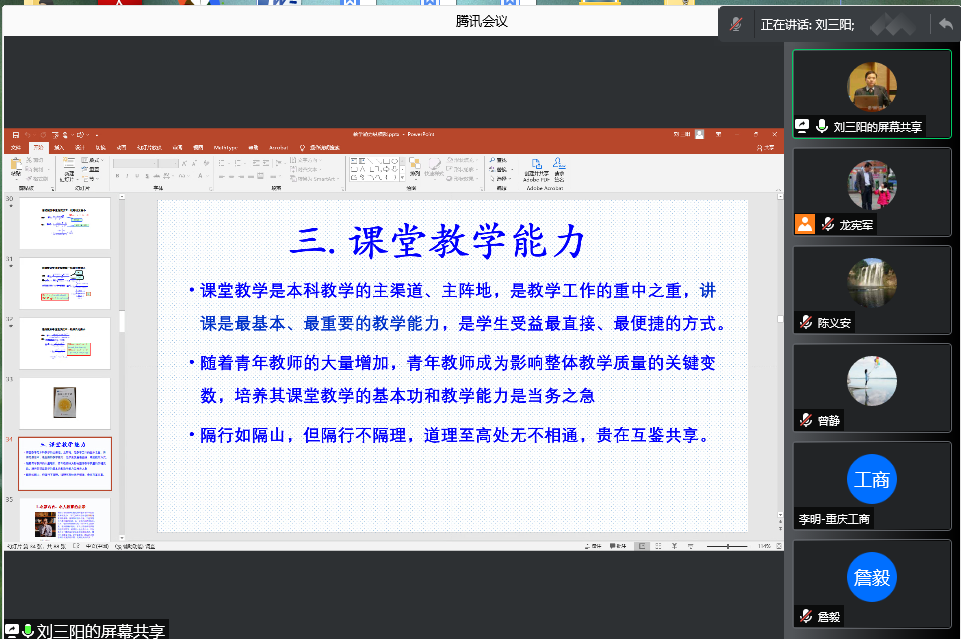 2021年12月1日,西安电子科技大学刘三阳教授为我院教师做了题为《教学能力纵横谈》的精彩报告,报告由数学与统计学院院长陈义安教授主持,部分教师参加了本次报告会。