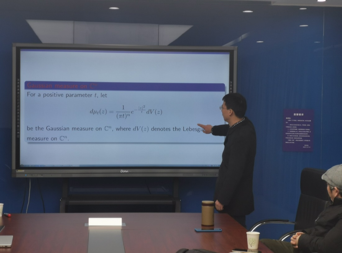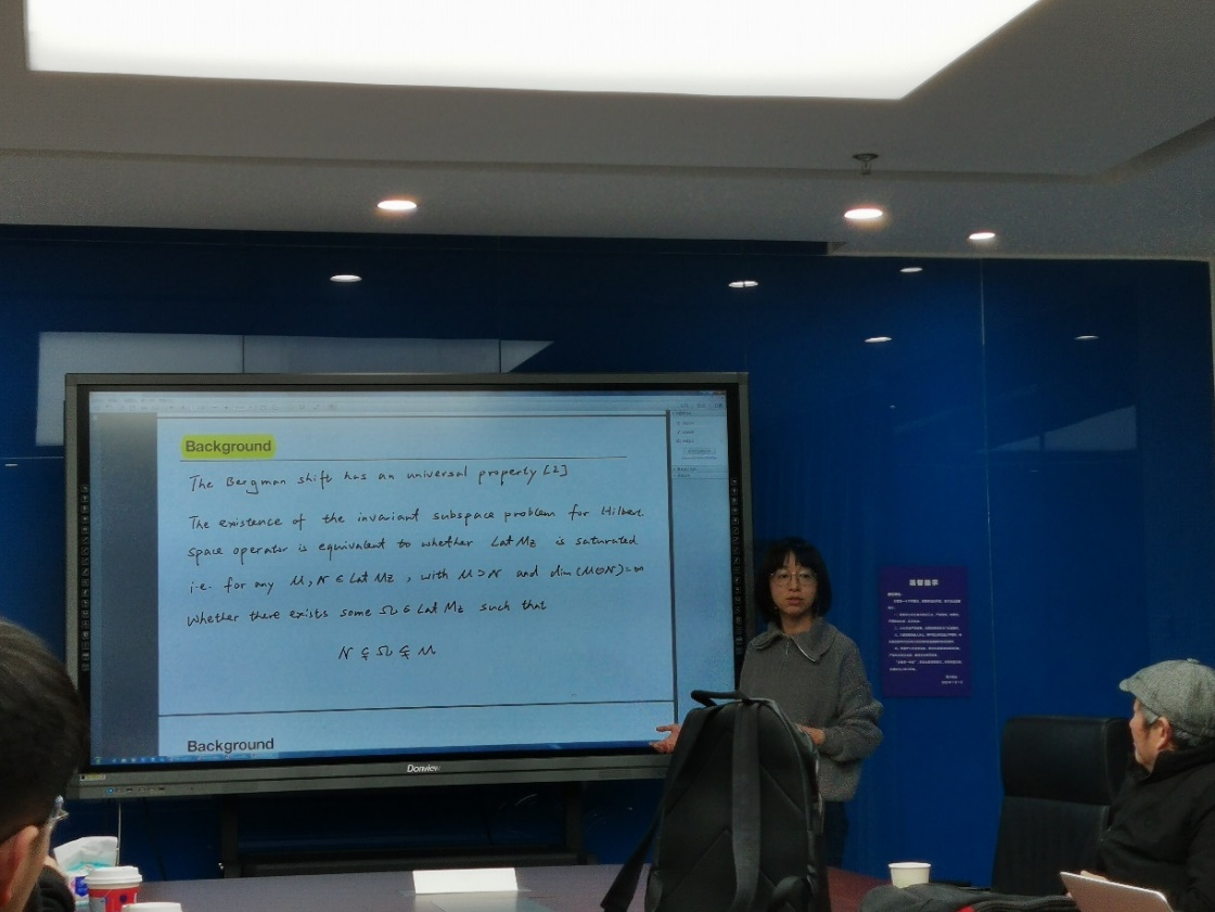 首先,王显金研究员以“Uniform Roe algebras of discrete groups and their spectral invariant dense subalgebras”为题,从经典的Fourier分析中的逼近问题引入了可数离散群对应的一致Roe代数中的逼近问题,讨论并给出了该一致Roe代数的谱不变子代数的刻画。接着,舒永录教授围绕题目“ON A SUFFICIENT CONDITION FOR FREQUENT HYPERCYCLICITY”首先引入了无界算子的频繁超循环的概念,建立了相应的频繁超循环准则,并用它考察了微分算子的频繁超循环性。然后,秦越石副教授报告了Bergman移位的不变子空间问题,深入浅出的剖析了孙顺华教授和郑德超教授通过将Bergman空间上移位算子的不变子空间问题提升到双圆盘Hardy空间上的技巧给出了Bergman移位的不变子空间的Burling型定理。这之后,赵显锋从“Toeplitz algebras over the Fock spaces”这个主题出发,报告了他及合作者近来在p-Fock空间上的Toeplitz代数的相关研究,证明了符号BUC(Cn)在的具有平移不变的子代数中的Toeplitz算子所生成的Toeplitz代数是由符号在相同空间的Toeplitz算子所线性生成的,他们的结果回答了Fulsche在(J. Funct. Anal. 279, 2020, Article 108661)一文中所提出的问题。每个报告结束后,与会的听众与报告者进行了热切的讨论和交流,报告者热情的回答了听众所提出的问题。