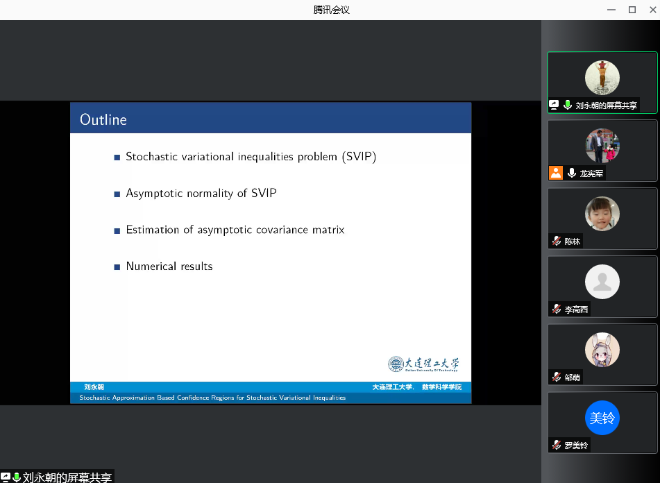 刘永朝教授首先介绍了随机变分不等式的SAA以及SA方法;其次介绍了通过随机对偶均值方法构造了求解随机变分不等式解的渐近置信域;然后介绍了在遍历意义和非遍历意义下SA解的渐近正态性以及正态分布协方差矩阵的在线估计;最后通过数值模拟给出了随机变分不等式解的渐近置信域。讲座结束后,刘教授同在线的老师和同学进行了交流。