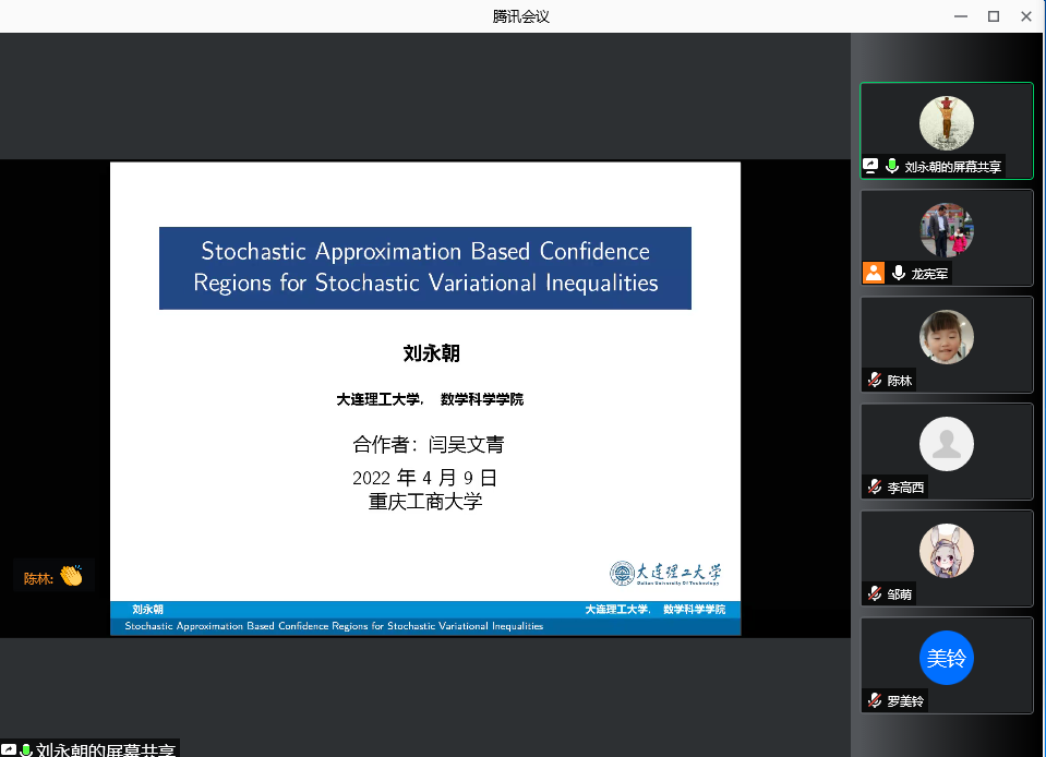 2022年4月9日下午,大连理工大学刘永朝教授为我院师生做了题为《Stochastic Approximation Based Confidence Regions for StochasticVariational Inequalities》的学术报告。本次报告由学院副院长龙宪军教授主持,孙祥凯、李高西、曾静、李耿华、黄应全以及重庆大学的蒋杰、重庆交通大学的彭再云和赵勇、重庆师范大学的陈林等老师以及研究生参加了此次学术报告。