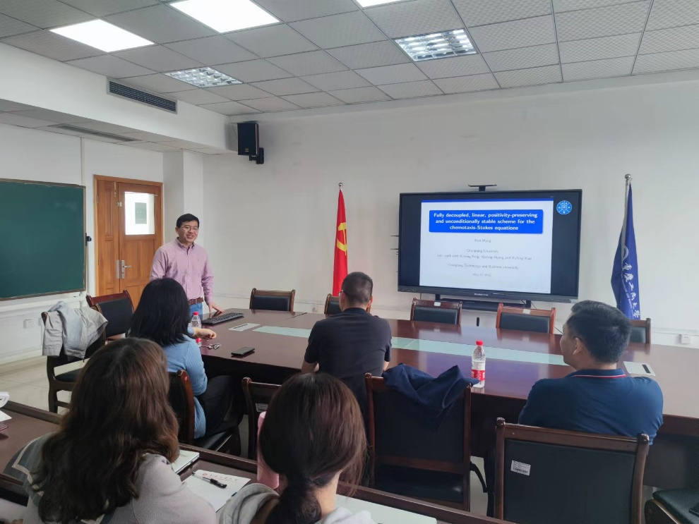 2022年5月22日上午10:30在学院会议室80602,重庆大学王坤副教授应邀为我院师生做了题为《Fully decoupled, linear, positivity-preserving and unconditionally stable scheme for the chemotaxis–Stokes equations》的学术报告。报告由数学与统计学院袁利军教授主持,学院部分老师以及研究生参加了此次学术报告。