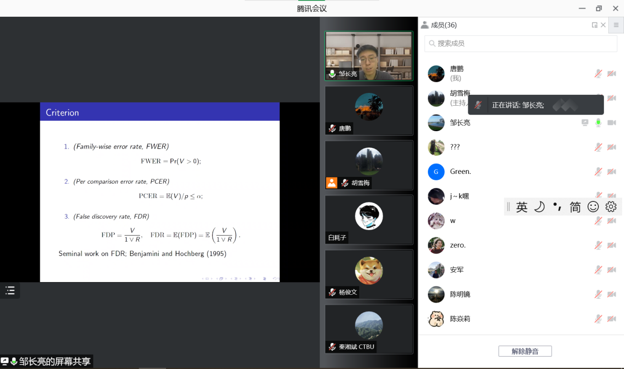 邹长亮教授的学术报告介绍了多重假设检验问题、 FWER和FDR两种错误率、Bonferroni校正和BH方法两种控制FWER的典型方法,提出了一个一般性的不依赖于p值的方法。核心想法是利用样本分割来构造一系列具有对称性的统计量并利用统计量的对称性近似错误发现的个数,挖掘相关结构信息提高检测能力。所提对称化数据整合方法(symmetrized data aggregation,SDA)方法通过样本分割、数据筛选和信息整合来充分挖掘相关结构中的信息。最后在协方差矩阵已知和未知两种情况下建立了SDA的FDR控制性质。