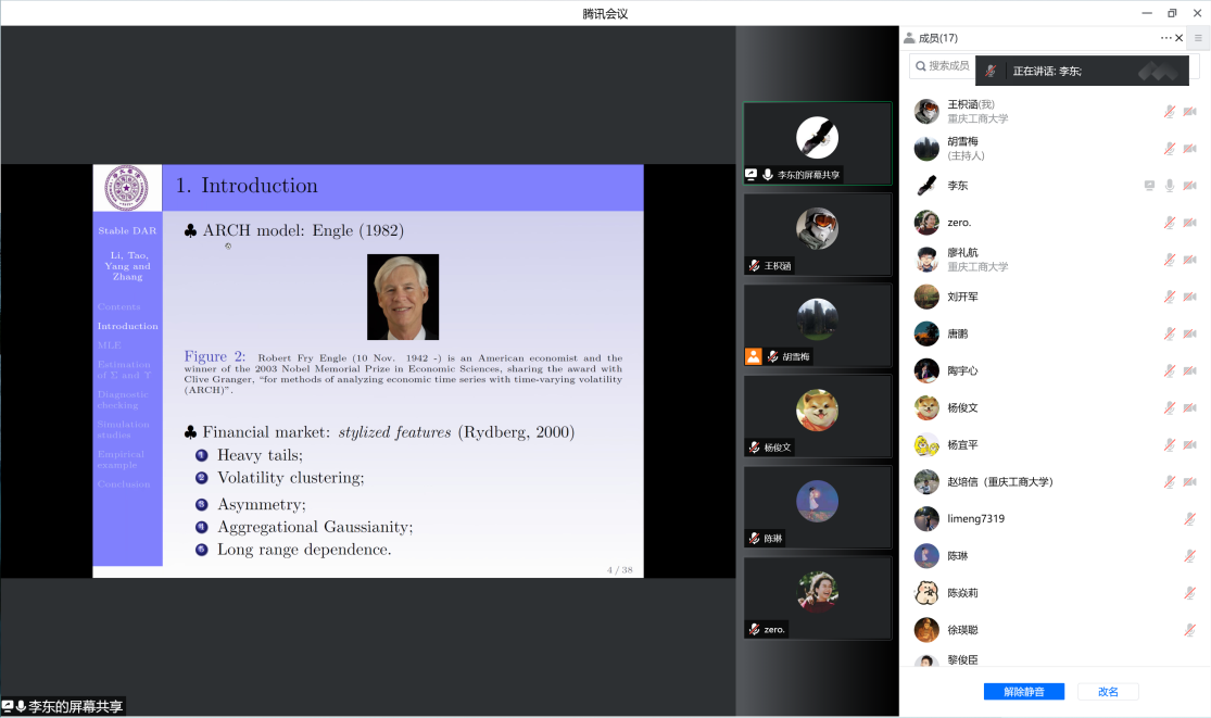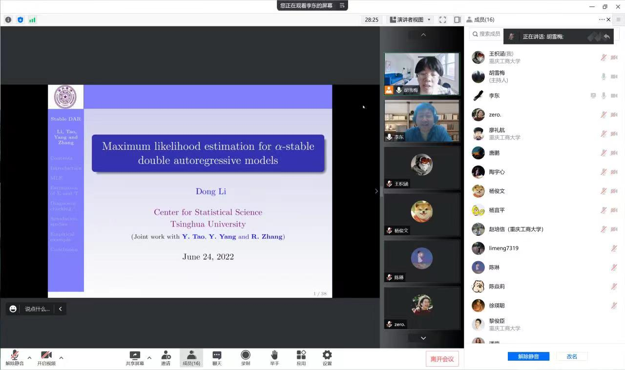 2022年6月24日星期五上午10:30,清华大学统计学研究中心李东副教授应胡雪梅教授邀请,为77779193永利集团数学与统计学院的师生作了题为《Maximum likelihood estimation for alpha-stable double autoregressive models》的高水平学术报告。学术报告由数学与统计学院胡雪梅教授主持,赵培信教授、杨宜平教授、程素丽博士等骨干老师和部分研究生参加了报告会。