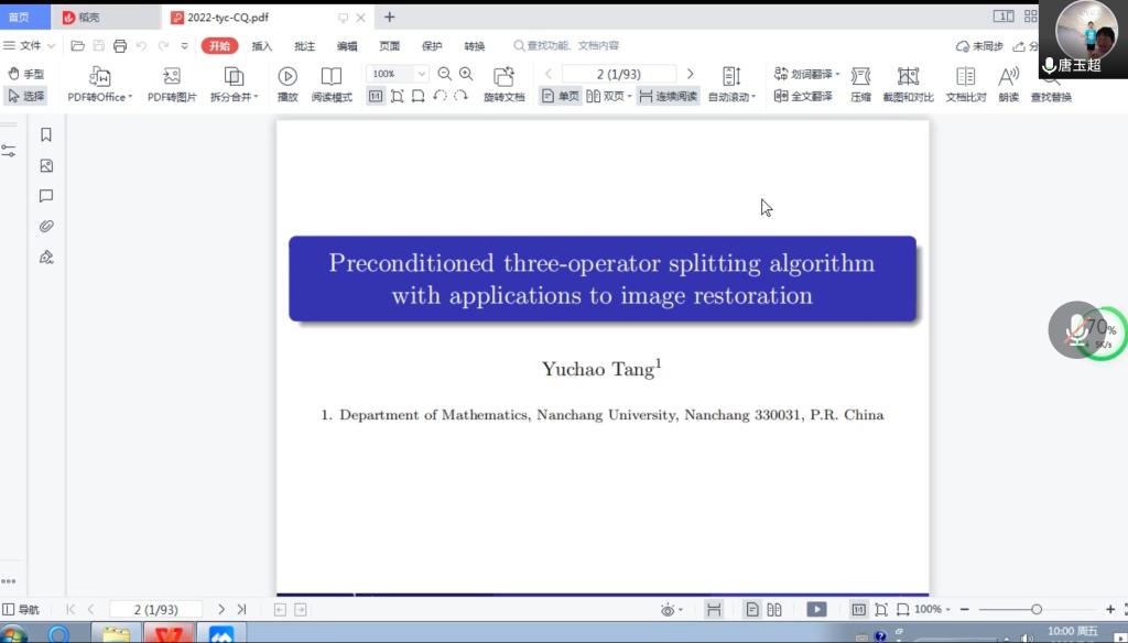 2022年07月08日上午,南昌大学唐玉超教授应邀为我院师生做了题为《Preconditioned three-operator splitting algorithm with applications to image restoration》的线上学术报告。本次报告由数学与统计学院副院长龙宪军教授主持,学院部分教师以及研究生参加了此次学术报告会。