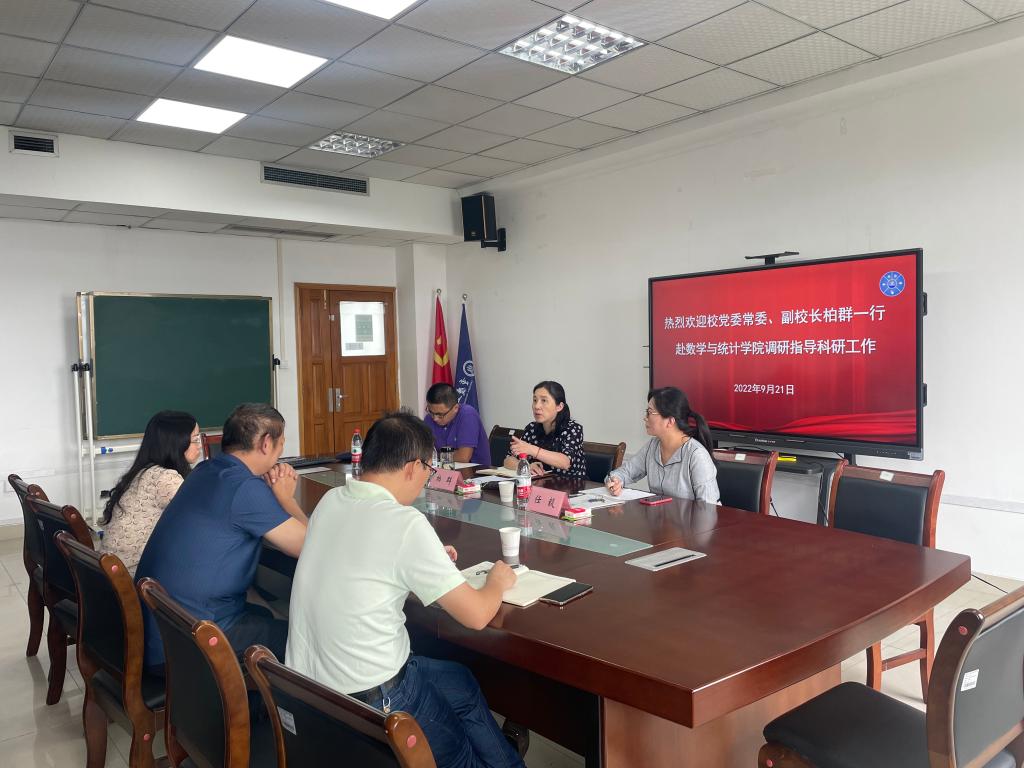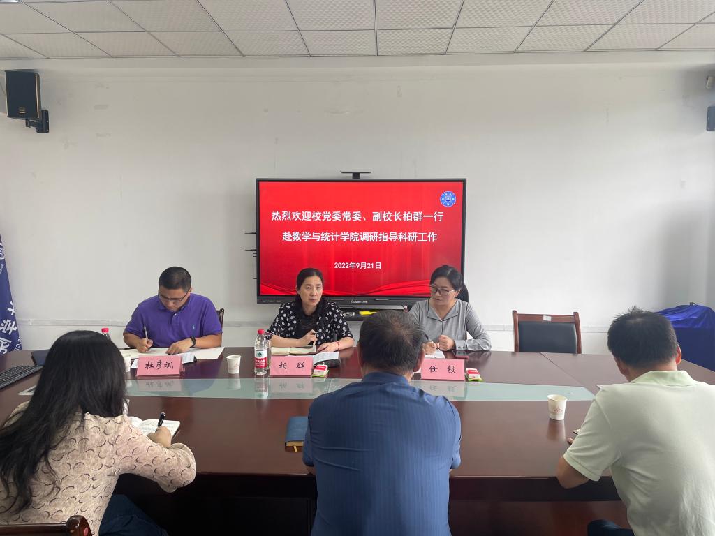 9月21日下午,校党委常委、副校长柏群赴数学与统计学院调研指导科研工作,科研处处长任毅、副处长杜彦斌陪同调研,数学与统计学院领导班子参加了调研会。