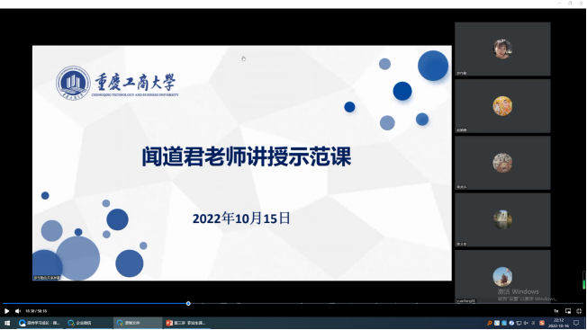 第二阶段,教师说课。一是新进教师谢豪、谢江明博士讲说课。学院领导和教师代表他们的说课进行了点评,对线上教学ppt展示方式、网络工具上课技巧的运用、针对不同专业本科生内容讲解难易程度等提出了意见建议。二是教师代表闻道君教授讲解示范课,给新进教师提供了大量宝贵的经验和建议。