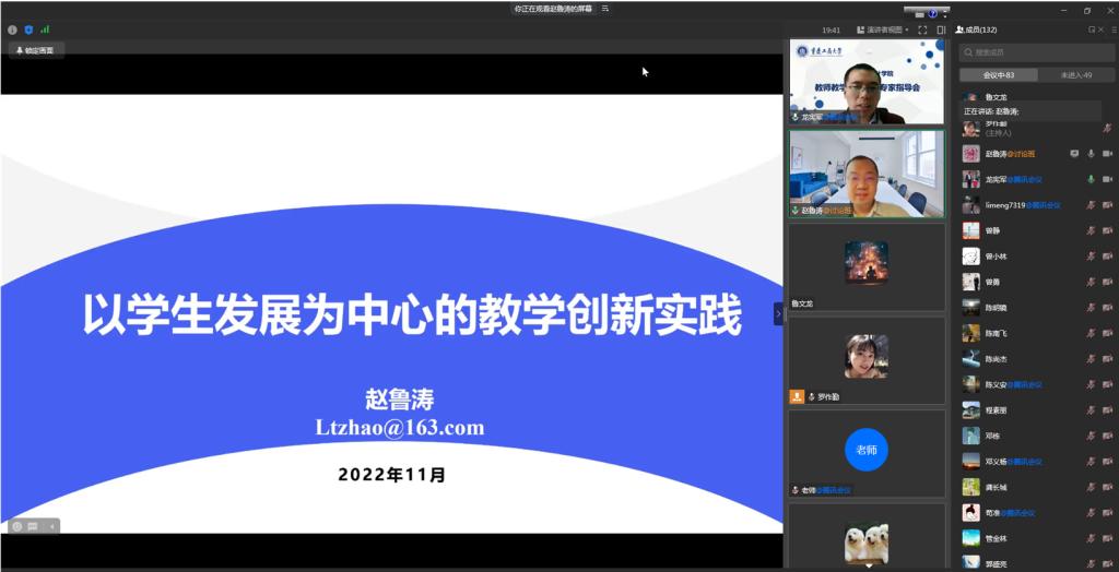 为深入贯彻全国教育大会和新时代全国高等学校本科教育工作会议精神,助力青年教师增强教学创新能力、提升教育教学水平,11月5日下午我院举办线上教师教学创新能力培训会,邀请全国高校青年教师教学竞赛一等奖获得者、北京理工大学赵鲁涛教授作主题为“以学生发展为中心的教学创新实践”专题讲座。院长陈义安、副院长龙宪军以及全体教师参会,龙宪军主持会议。