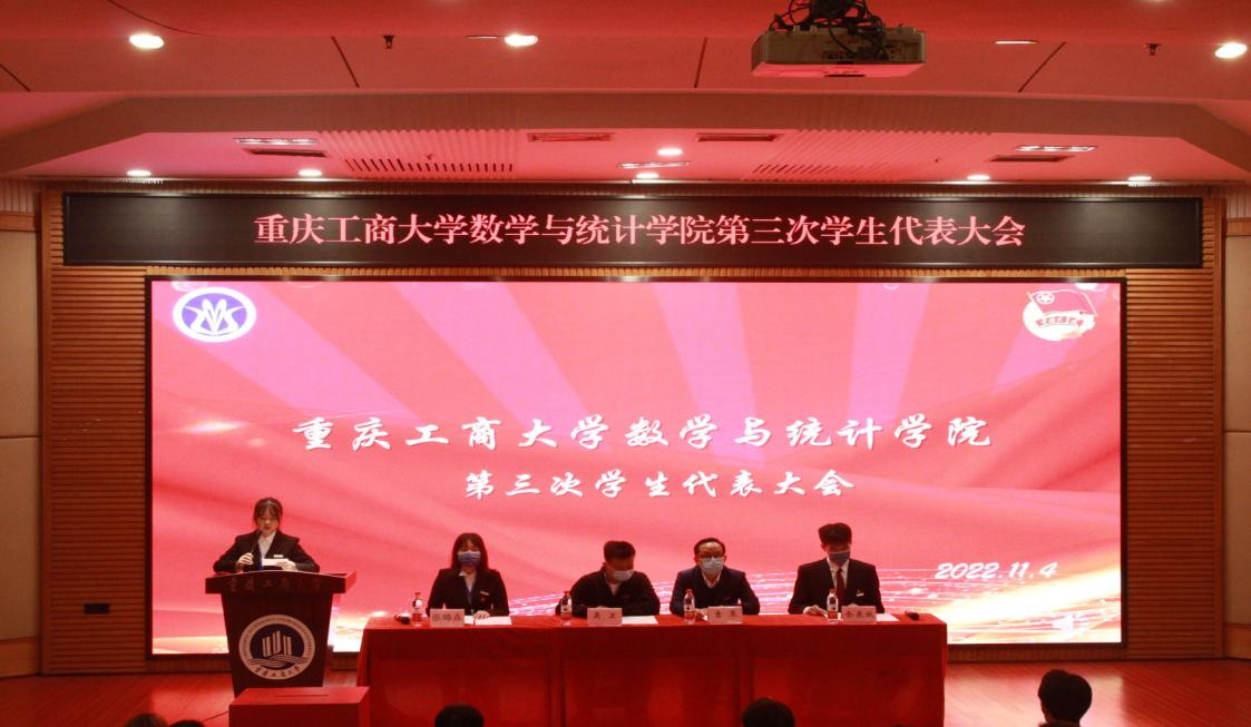 2022年11月4日下午,数学与统计学院第三次学生代表大会在博智楼7200报告厅胜利召开。学院党委副书记吉杲、分团委书记吴卫、校学生会主席团成员余东放以及学院84名学生代表参会,会议由学生会主席团成员郑易主持。