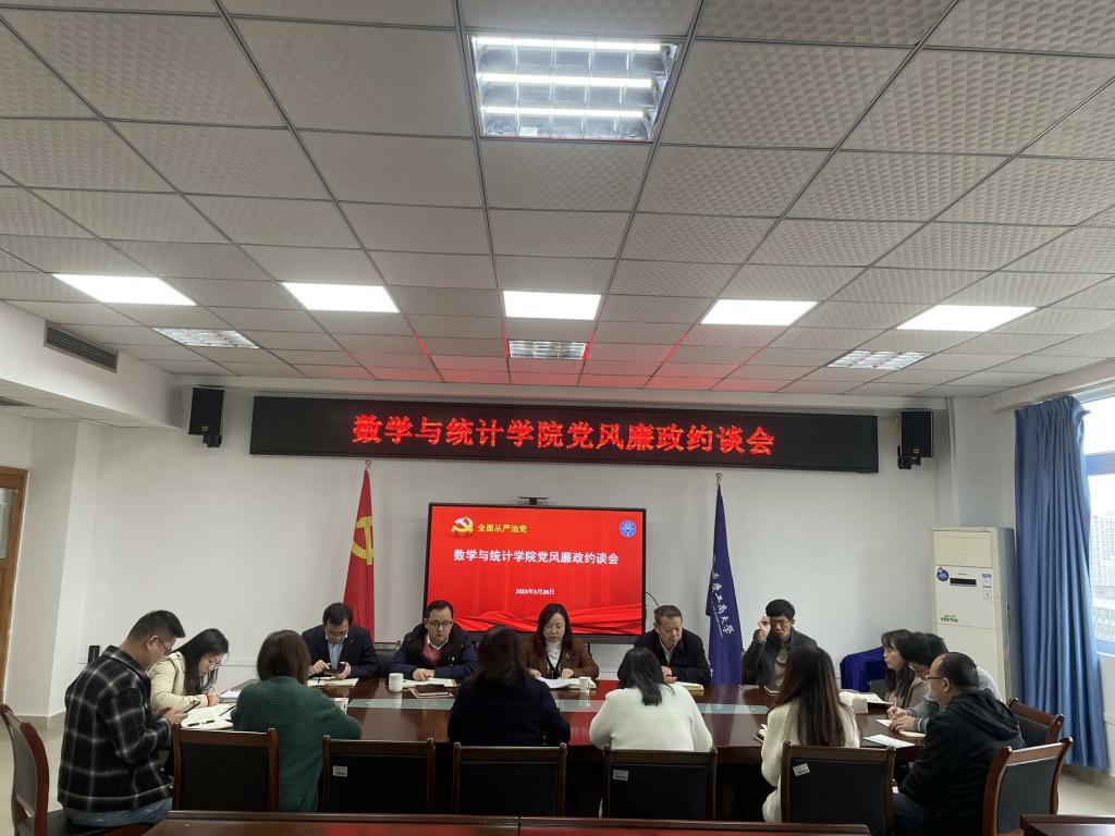 3月28日上午,数学与统计学院党委在80602会议室开展重点人头、重点岗位党风廉政建设约谈会,学院领导班子及所有行政人员参加了会议,会议由学院党委书记潘焱主持。