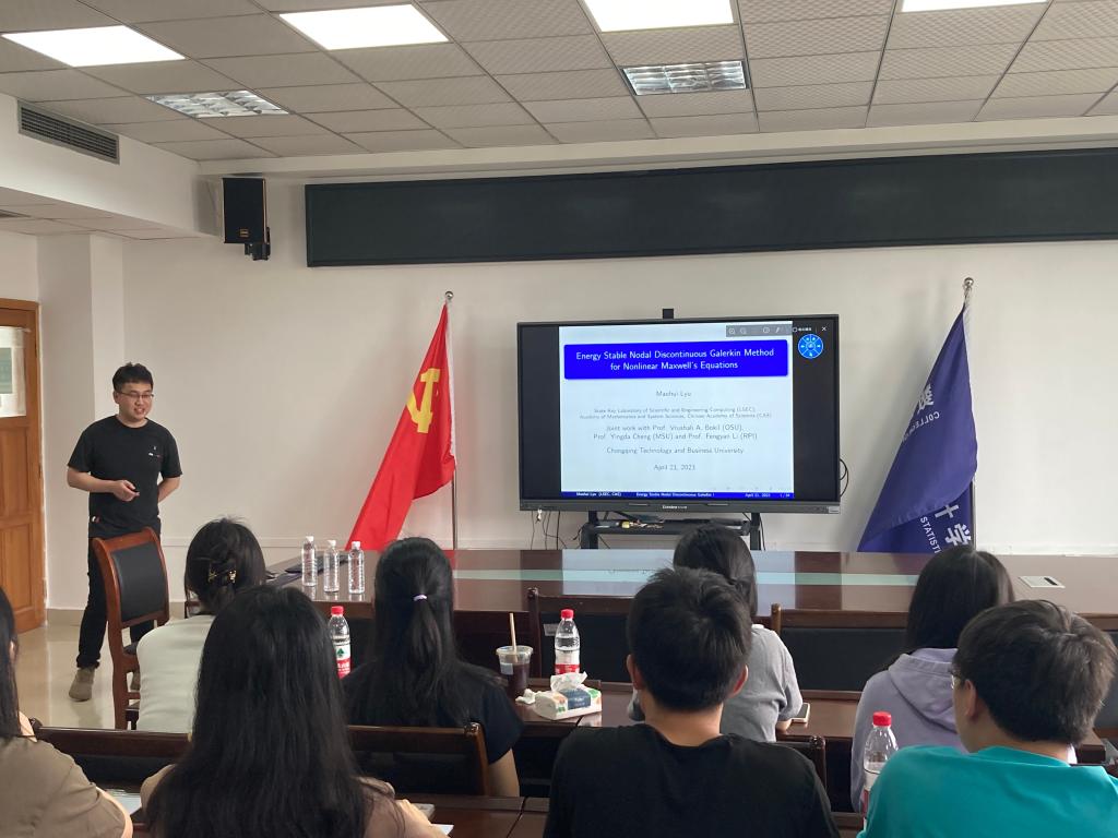 2023年4月21日下午,中科院计算数学与科学工程计算研究所吕茂辉博士在启智楼80602学院会议室做了题为《Energy stable Nodal discontinuous Galerkin method for nonlinear Maxwell equations》。本次学术报告由数学与统计学院袁利军教授主持,邹黎敏副教授、李耿华副教授、谢江明博士等骨干老师和计算数学、统计学方向的研究生参加了此次学术报告会。