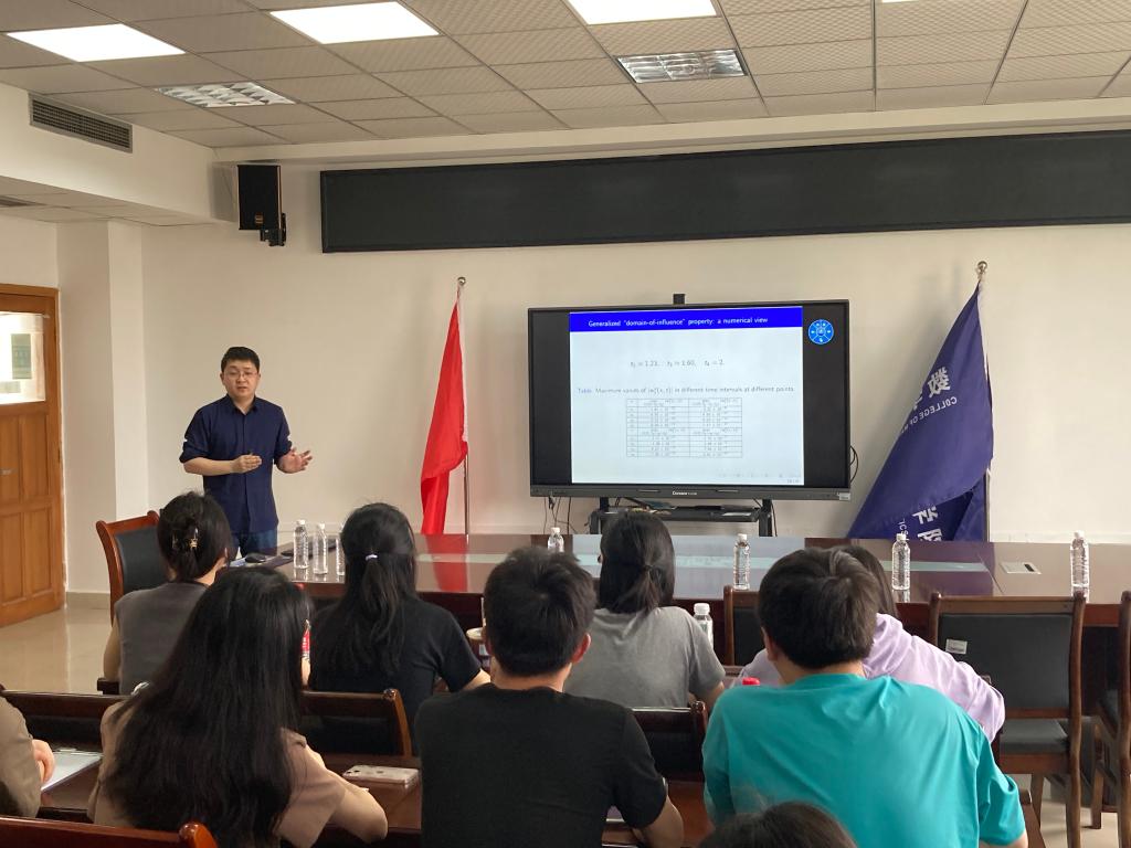 殷涛副研究员首先介绍了波动物理学的原理;其次介绍了在傅里叶变换边界积分方程法解决时域波动方程问题方面的最新研究成果;最后介绍了波动方程问题的多重散射频率-时间混合问题的发展趋势。殷涛副研究员的精彩报告,给与会师生带来了新的研究热点和研究思路。报告结束后,殷涛副研究员耐心地回答了与会老师和同学的各种问题。