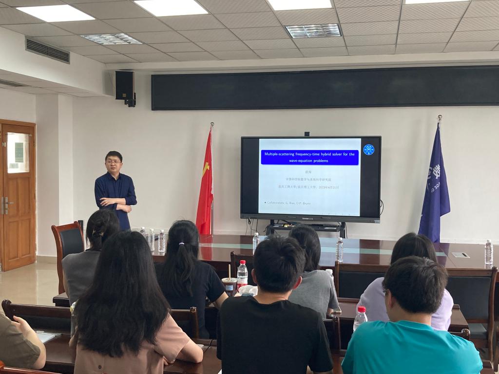 2023年4月21日下午,中科院计算数学与科学工程计算研究所殷涛副研究员在启智楼80602学院会议室做了题为《Multiple-scattering frequency-time hybrid solver for the wave-equation problems》的学术报告。本次学术报告由数学与统计学院袁利军教授主持,邹黎敏副教授、李耿华副教授、谢江明博士等骨干老师和计算数学、统计学方向的研究生参加了此次学术报告会。