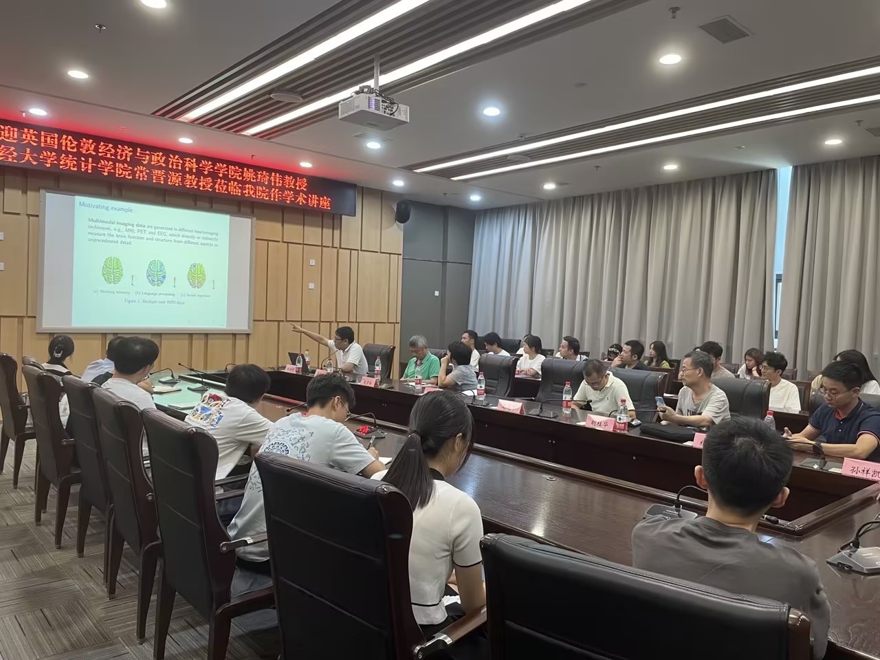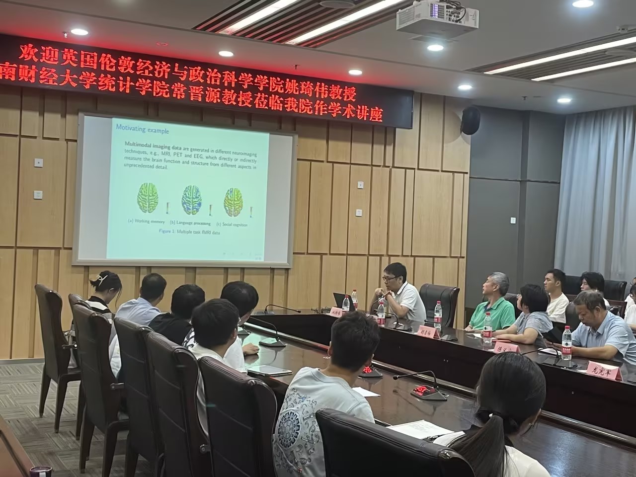 常晋源教授的学术报告主要介绍多模态成像数据复杂依赖的统计推断,提出了严格的统计检验方法。基于HCP(Human Connectome Project)的多任务fMRI数据分析,解决了三个假设检验问题: (a)检验不同脑区图像模式的独立性,(b)检验成像模式的脑区之间的独立性,(c)检验不同模式脑区之间的独立性,发展了控制虚假发现率的全局检验方法和多重检验方法,研究了所提检验的理论性质,发展了计算高效的分布算法。报告结束后,姚琦伟教授和常晋源教授就学院统计学科建设和科学研究等方面和学院领导展开了深入交流。