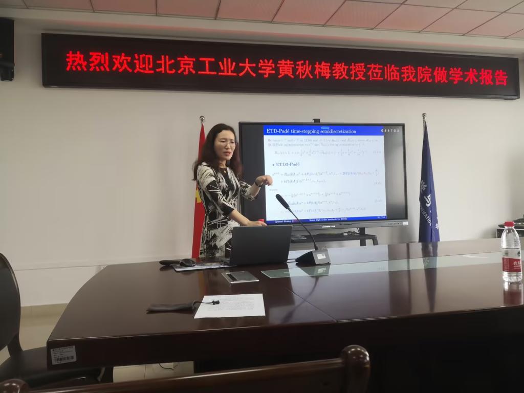 黄教授的学术报告首先介绍了时滞偏微分方程在科学与工程计算中重要且广泛的应用;其次介绍了抛物型时滞偏微分方程的空间有限元方法,时间间断伽辽金方法以及ETD-Padé逼近方法;最后介绍了该方程的实际应用并验证了理论和方法的精确性。报告结束后,黄教授与老师和同学们进行了交流。