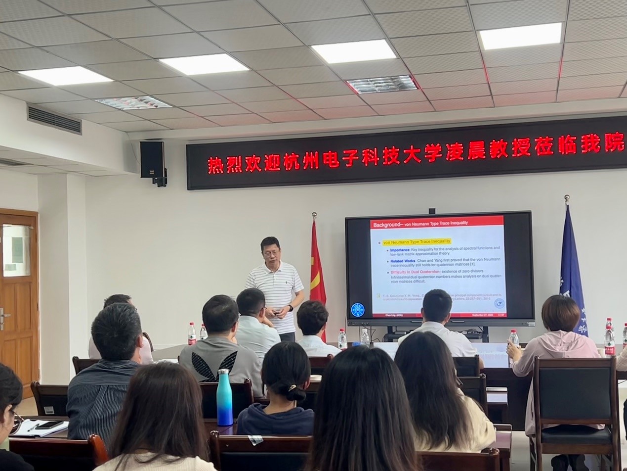 2023年9月27日下午,应学院邀请,杭州电子科技大学凌晨教授莅临我院开展学术交流,并在80602会议室做了题为《Singular Values, von Neumann Type Trace Inequality of Dual Quaternion Matrices, and Their Low-Rank Approximations》的学术报告。学术报告由学院副院长龙宪军教授主持,孙祥凯教授、李高西副教授、曾静副教授、李耿华副教授、黄拉博士和运筹学与控制论专业的研究生参加了报告会。