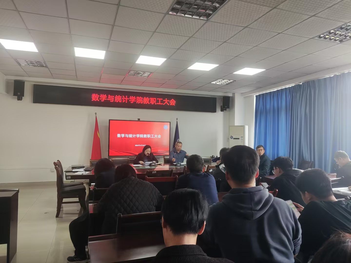 3月22日下午,数学与统计学院举行了3月教职工大会,党委书记潘焱、院长陈义安、副院长叶勇及全体教职工参加了会议,会议由潘焱主持。